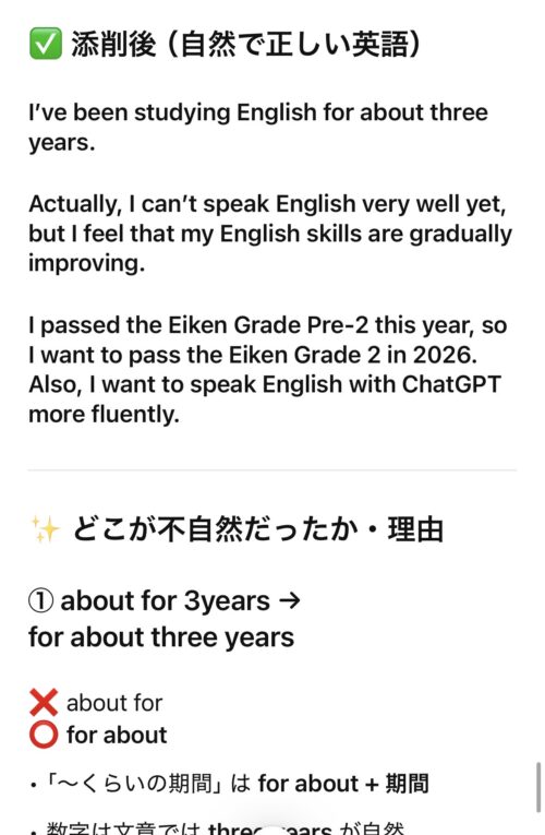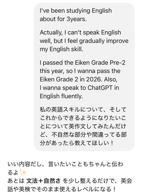来年は英検2級合格、そして英検の学習を通して作文力も会話力もしっかり鍛えていきたいです。チャットGPTと英会話練習できるレベルにはなりたいなぁ…